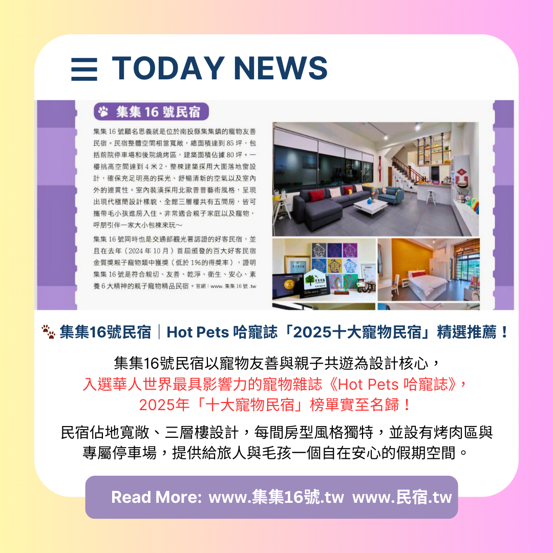 🐾 集集16號民宿 入選 Hot Pets 哈寵誌「2025十大寵物民宿」精選推薦!